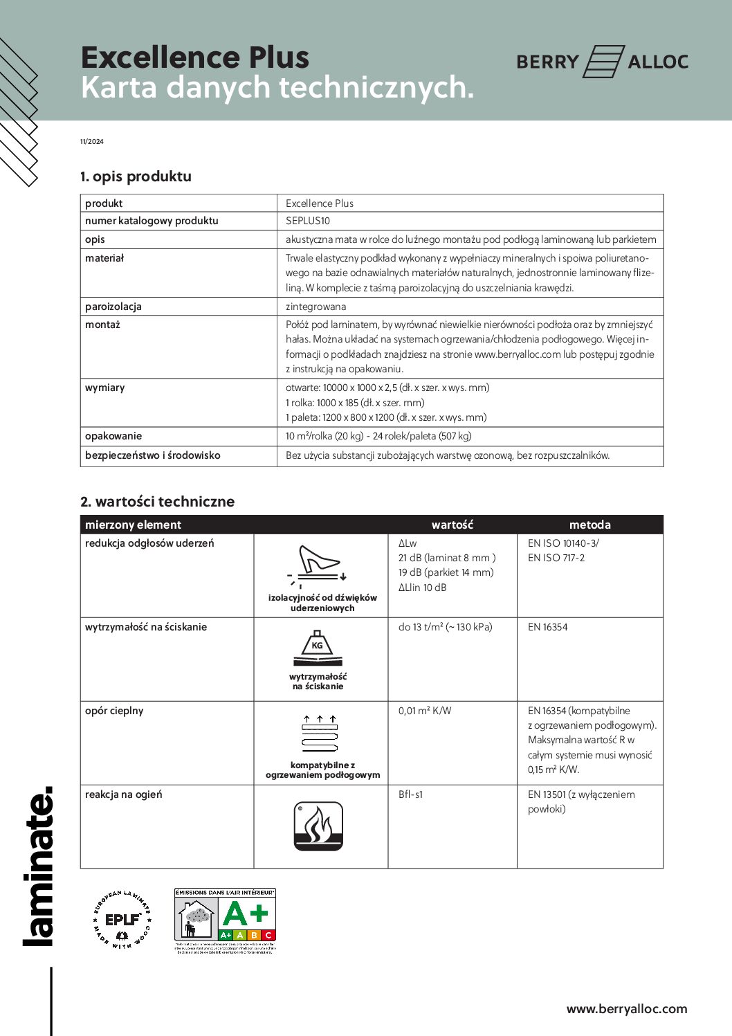 ⩥ Mata wyciszająca BERRYALLOC EXCELLENCE PLUS o grubości 2,5mm redukuje odgłos kroków i dźwięków transmisyjnych, nadaje się świetnie do wszystkich podłóg twardych takich jak podłogi laminowane i parkiety.